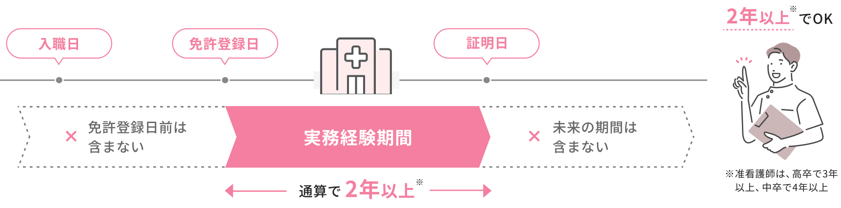 常勤勤務で、透析療法についての実務経験年数を満している臨床工学技士、看護師、准看護師が対象となります。実務経験年数の数え方は、免許証の免許登録日から、申請書類の提出日現在(証明日)で計算します。